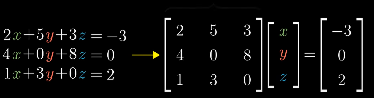 미지수와 미지수의 스케일링 배의 합으로 이루어진 식은 위처럼 행렬로 바꾸어 쓸 수 있다.