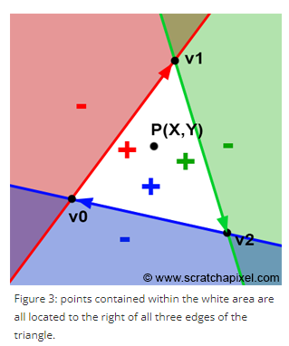 좌표상의 한 점을 edge function으로 모든 변에 대해 수행했을 때, 모든 값이 양수 이면 이 점은 삼각형 안에 있는 점이다.