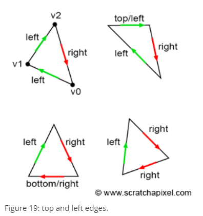 left edge는 위로 올라가는 edge이다. vector V[(X+1)%3] - V[X] 값이 y는 양수이다.