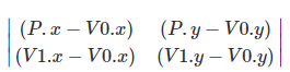 이는 vector(v1 - v0)와 vector(P - v0) cross product 값과 같다.