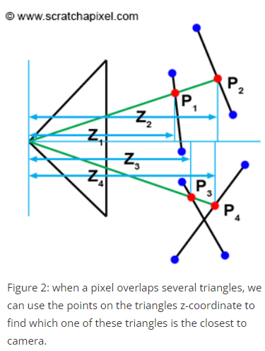 visibility problem을 해결하기 위해 삼각형을 Depth로 정렬하고 카메라와 더 가까운 삼각형을 그릴 수 있다. 하지만 이 방법은 충분하지 않다. 위 그림에서 보는 것처럼 삼각형이 서로 겹쳐 있으면 정확한 그림을 그릴 수 없다. (P3, P4)