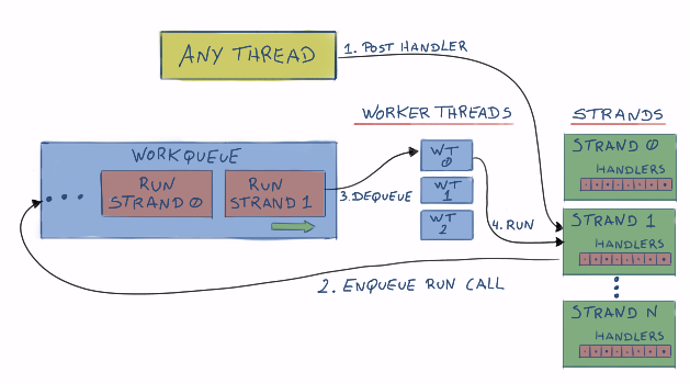 worker thread가 직접 handler를 호출하지 않고 strand queue에 쌓는다.