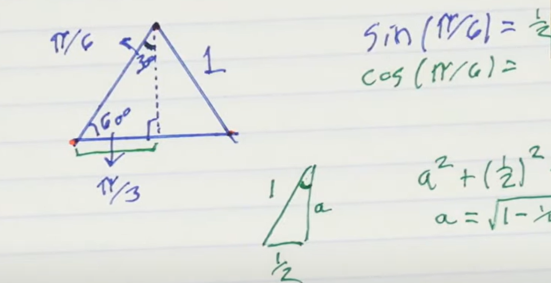 정삼각형 성질을 이용하여 pi/6 각도의 sin, cos 값을 알 수 있다.
